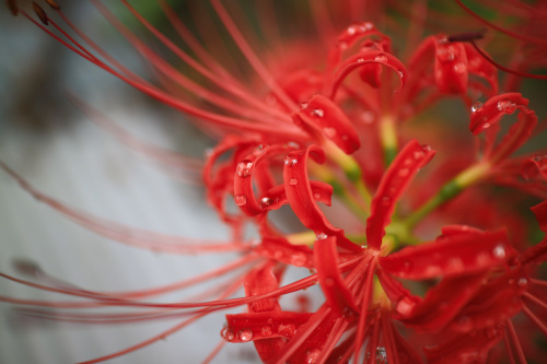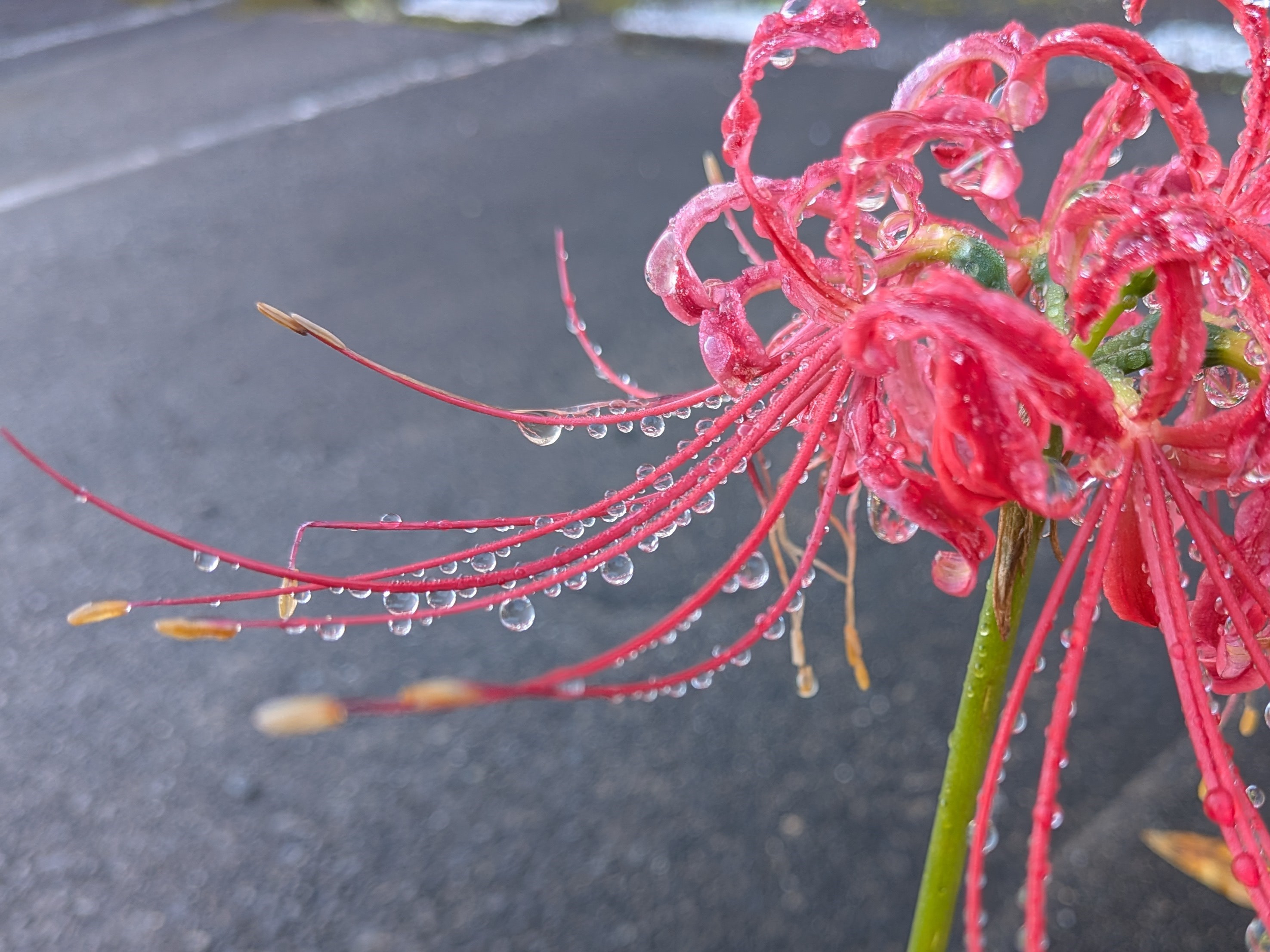 スタッフ用駐車場の一角に咲いていたその彼岸花も、今年の見納めでした。雨上がりの朝、光を受けて水滴がきらめき、花びらの縁が透けるように輝いていました。カメラのファインダー越しに見たその姿は、言葉では言い表せないほど美しく、儚く、そして力強かったのです。