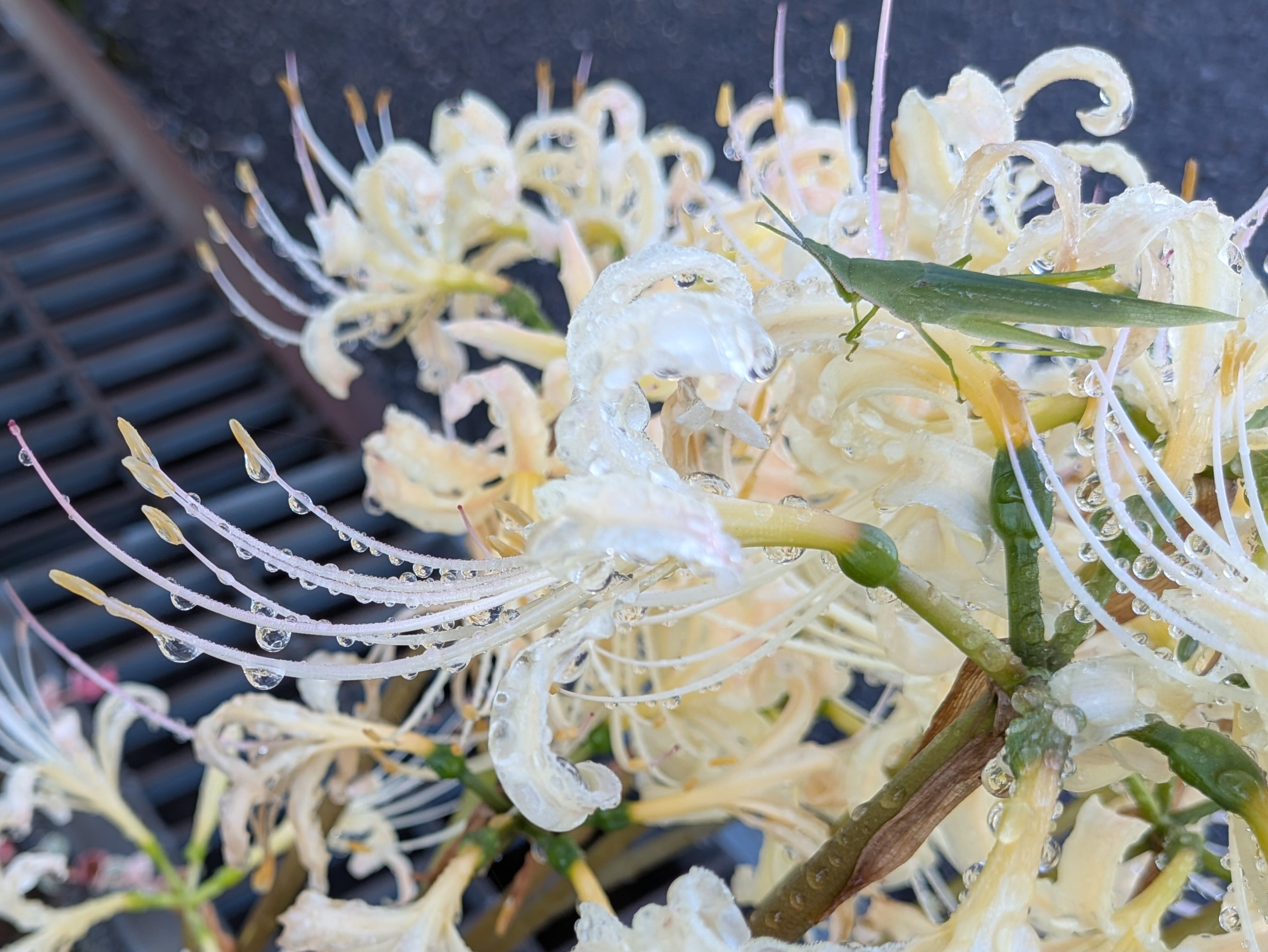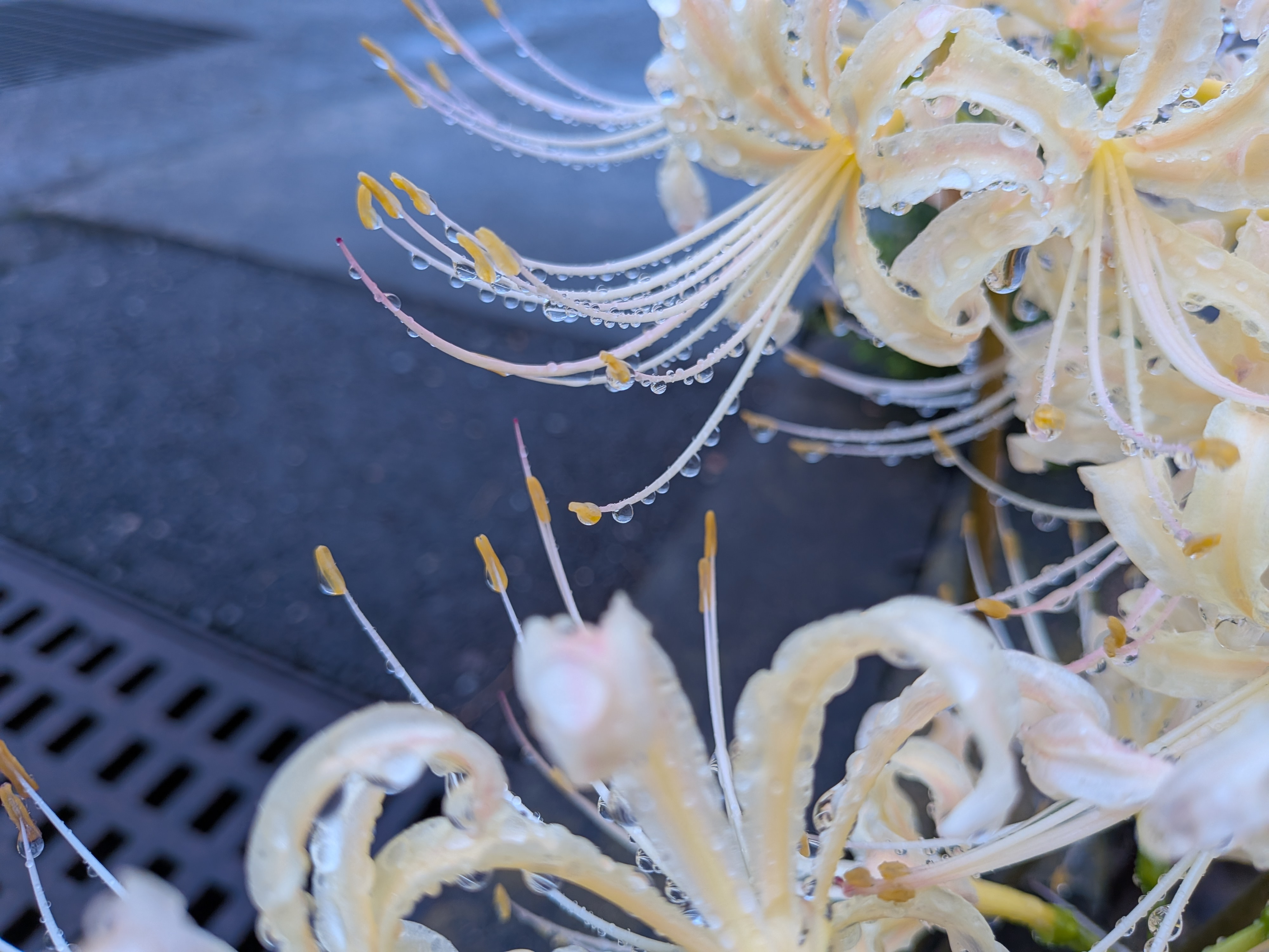 朝、雨が上がったばかりの空気は澄んでいて、どこか静けさをまとっていました。会社のスタッフ用駐車場からオフィスに向かうまでの片隅に、今年最後の彼岸花が咲いていました。赤と白。終わりかけの花びらに、雨粒がそっと乗って、まるで涙のように光っていました。