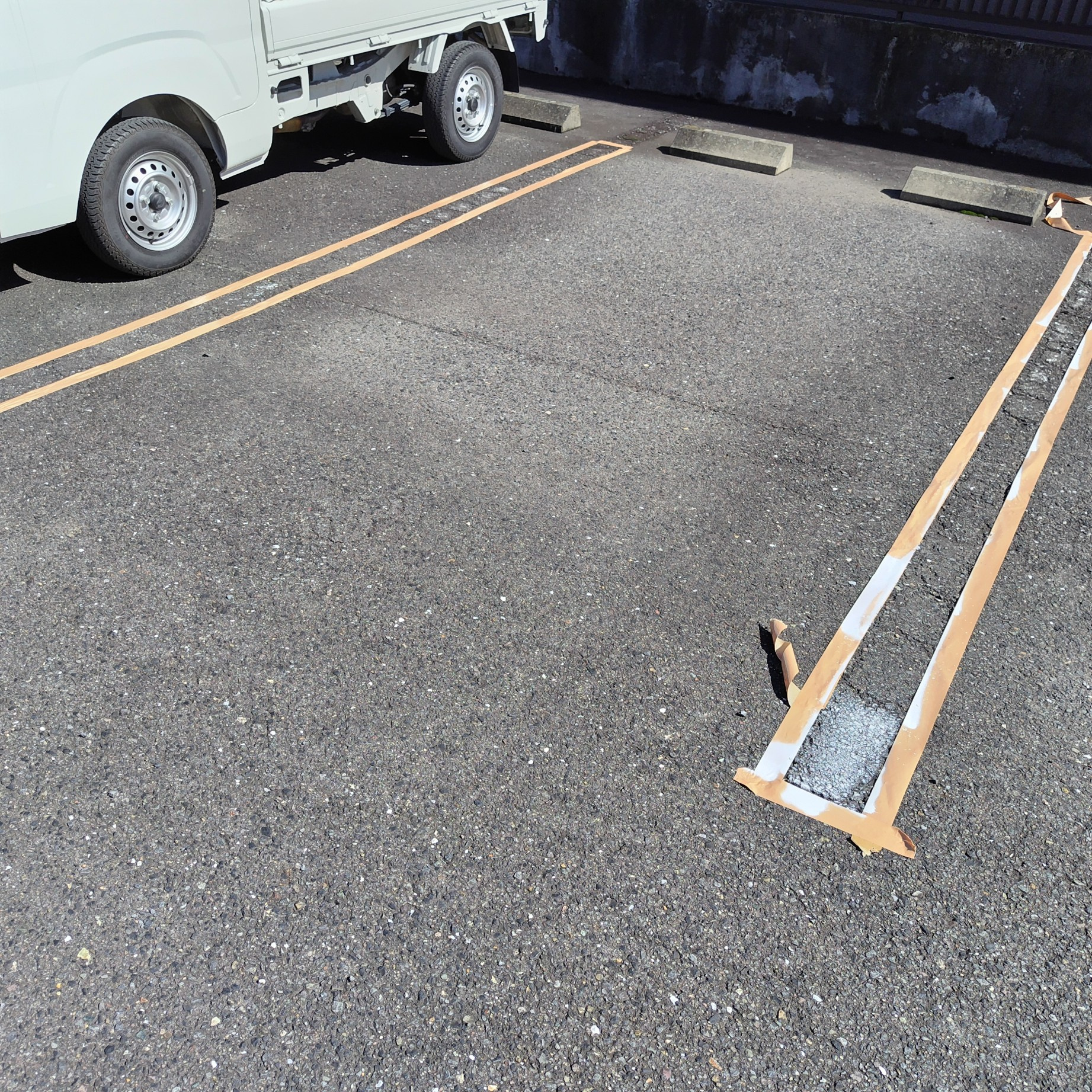 ただし、スプレー式は「養生(マスキング)」が非常に重要です。ラインの境界がぼやけてしまうと、見た目の印象が悪くなるだけでなく、駐車位置の認識にも影響します。そのため、養生テープやフロアテープを使って、スプレー前にしっかりとラインのガイドを作る必要があります。業者さんに依頼するのではなく弊社担当者にて作業しますので、ある程度日程にも自由が効きます。