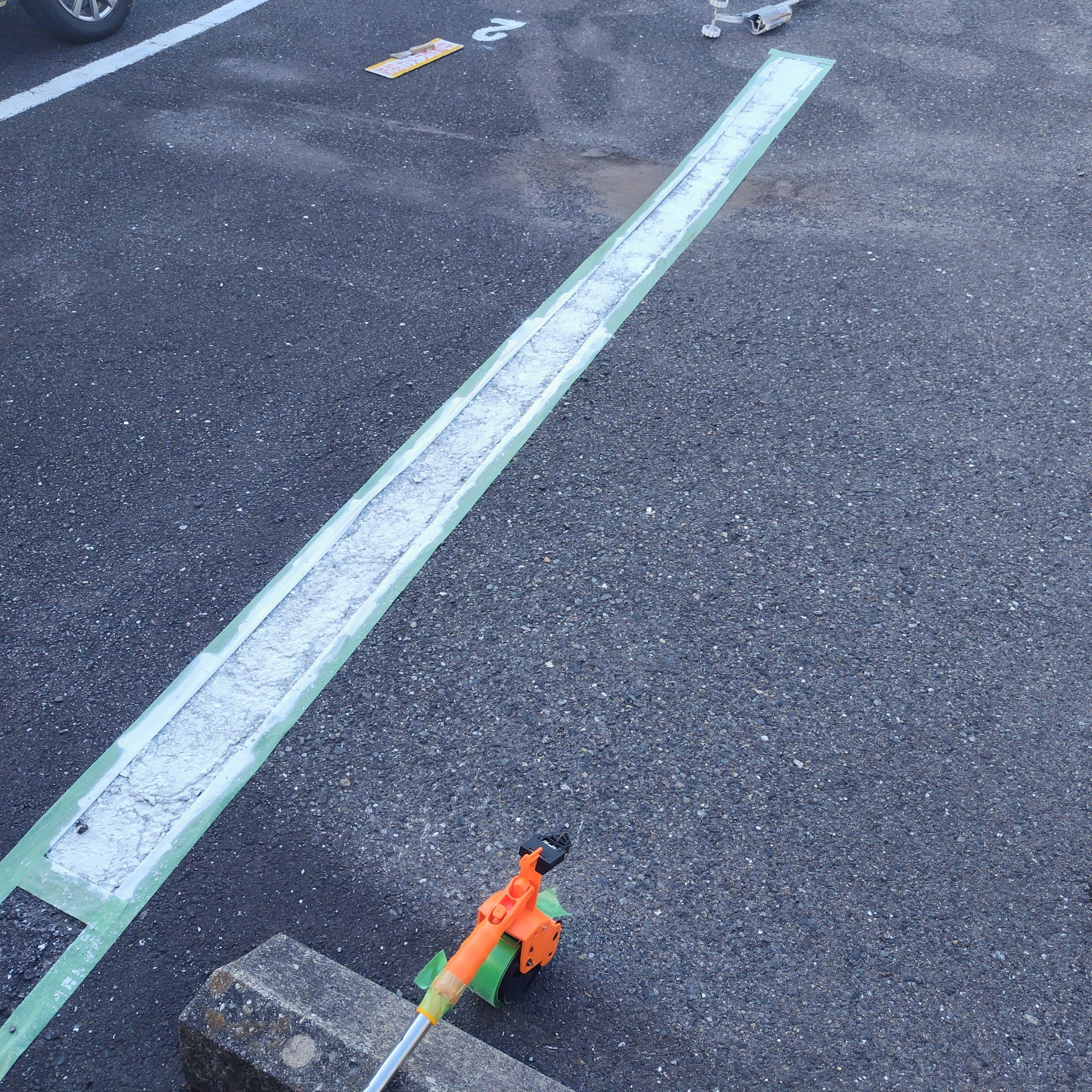ディスペンサーは便利ではありますが、どうしても機械的な動きになるため、地面の状態によってはテープが浮いたり、ズレたりすることがあります。特にアスファルトのひび割れや傾斜がある場所では、手作業のほうが細かい調整がしやすいと感じました。