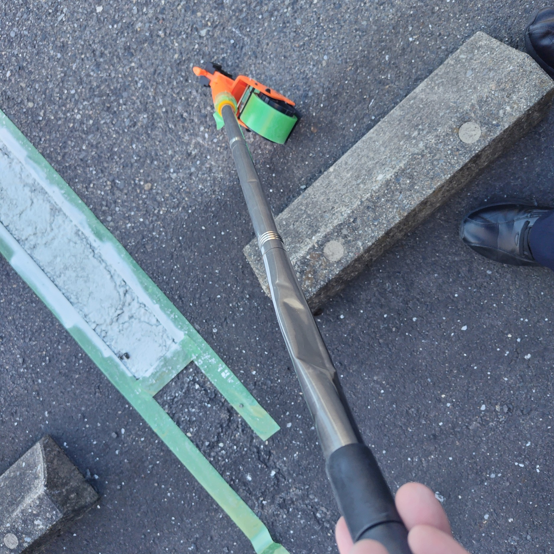 今回の施工では、初めて「フロアテープディスペンサー」を導入しました。これは、養生テープを地面に貼る作業を効率化するためのツールで、ローラー付きの本体にテープをセットし、地面を転がすことでテープを貼っていくという仕組みです。