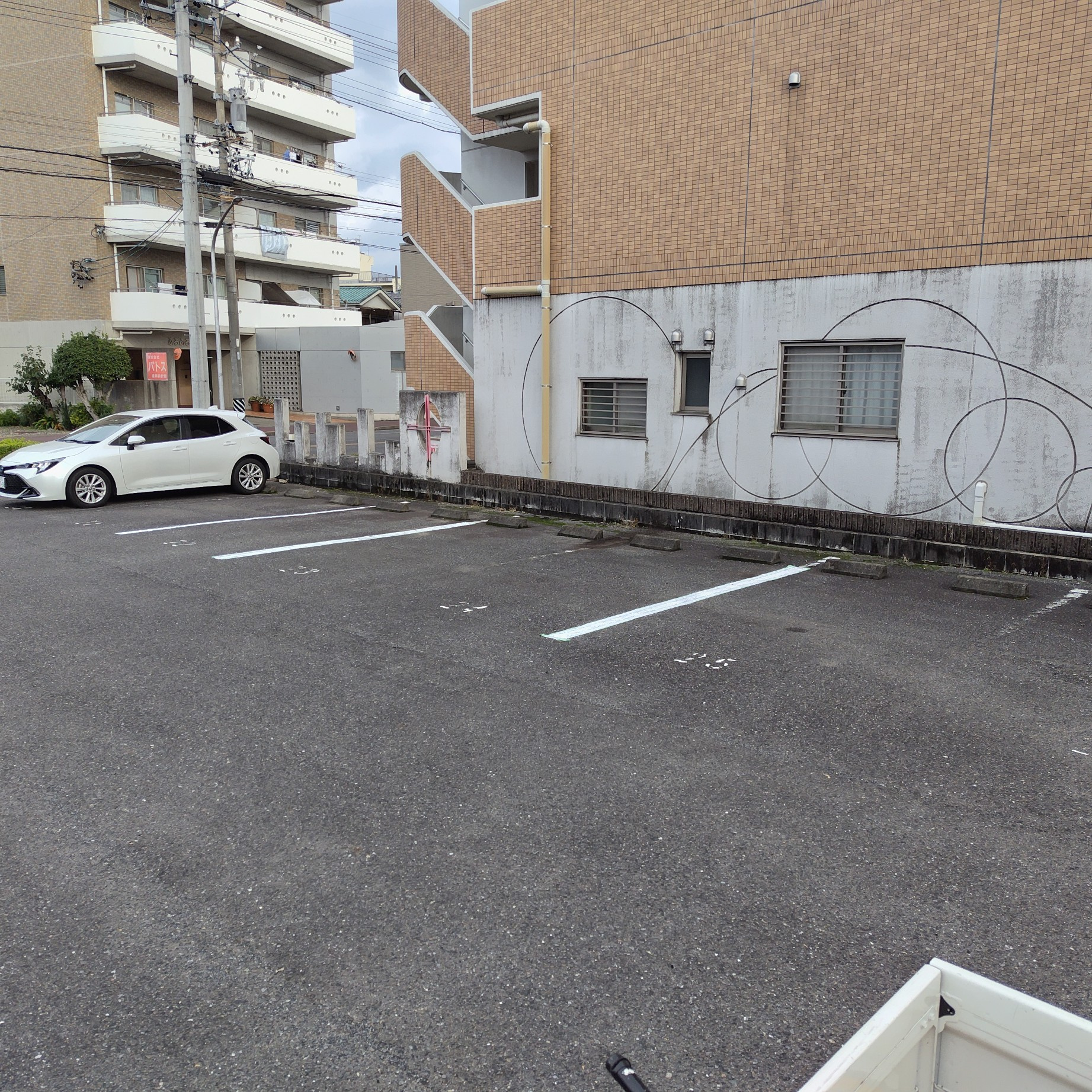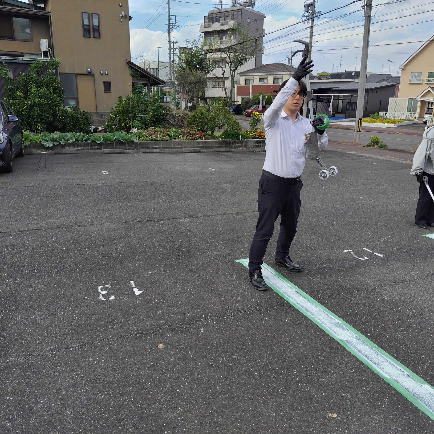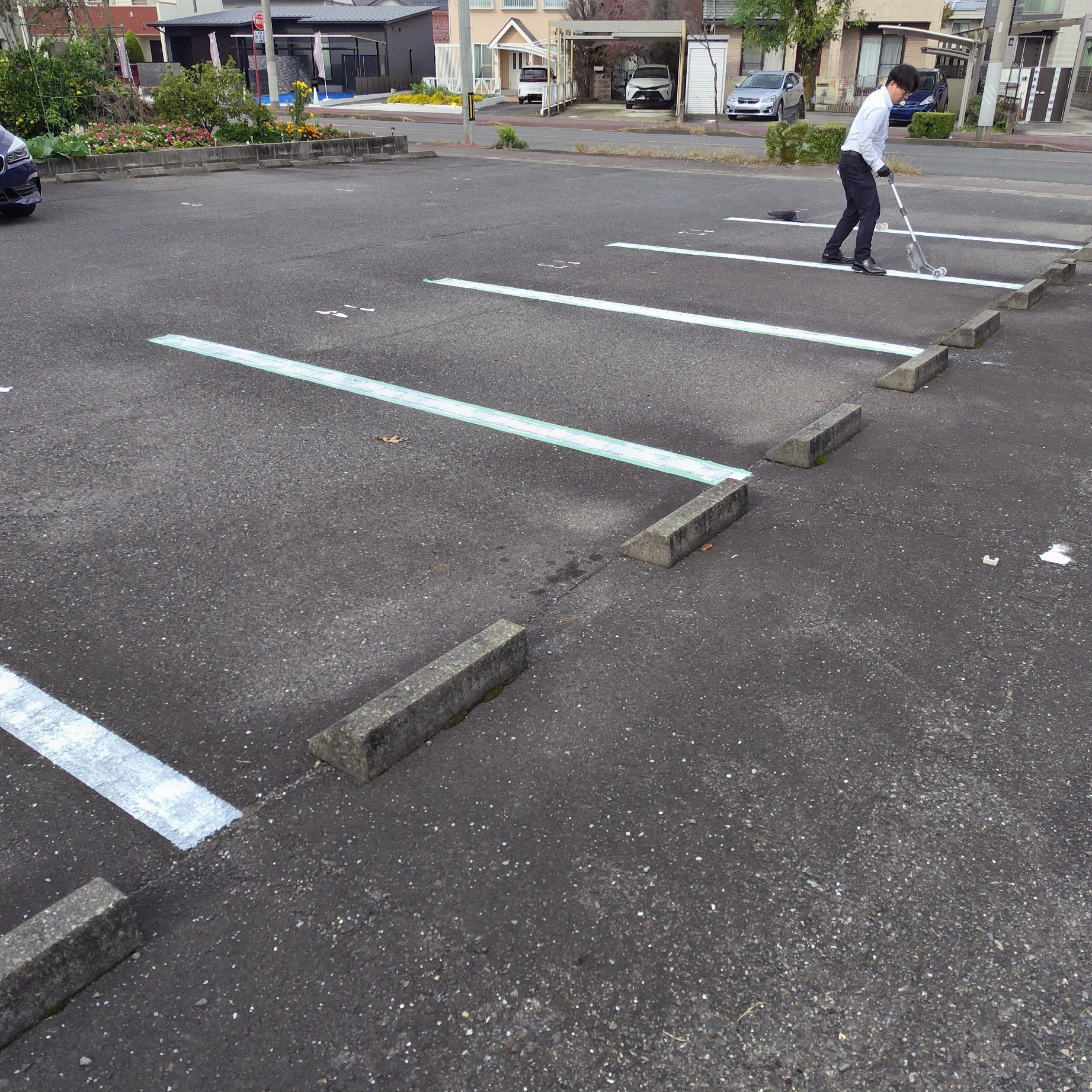 当日は、管理部の皆さんが必要な道具やスプレーを準備してくださり、私はその中に混じって作業を開始。対象の駐車場は全26区画ありましたが、当日は一部に車両が停まっていたため、施工できたのは19本。残りの7本については、すでに作業手順を覚えたので、後日改めて自分で施工する予定です。