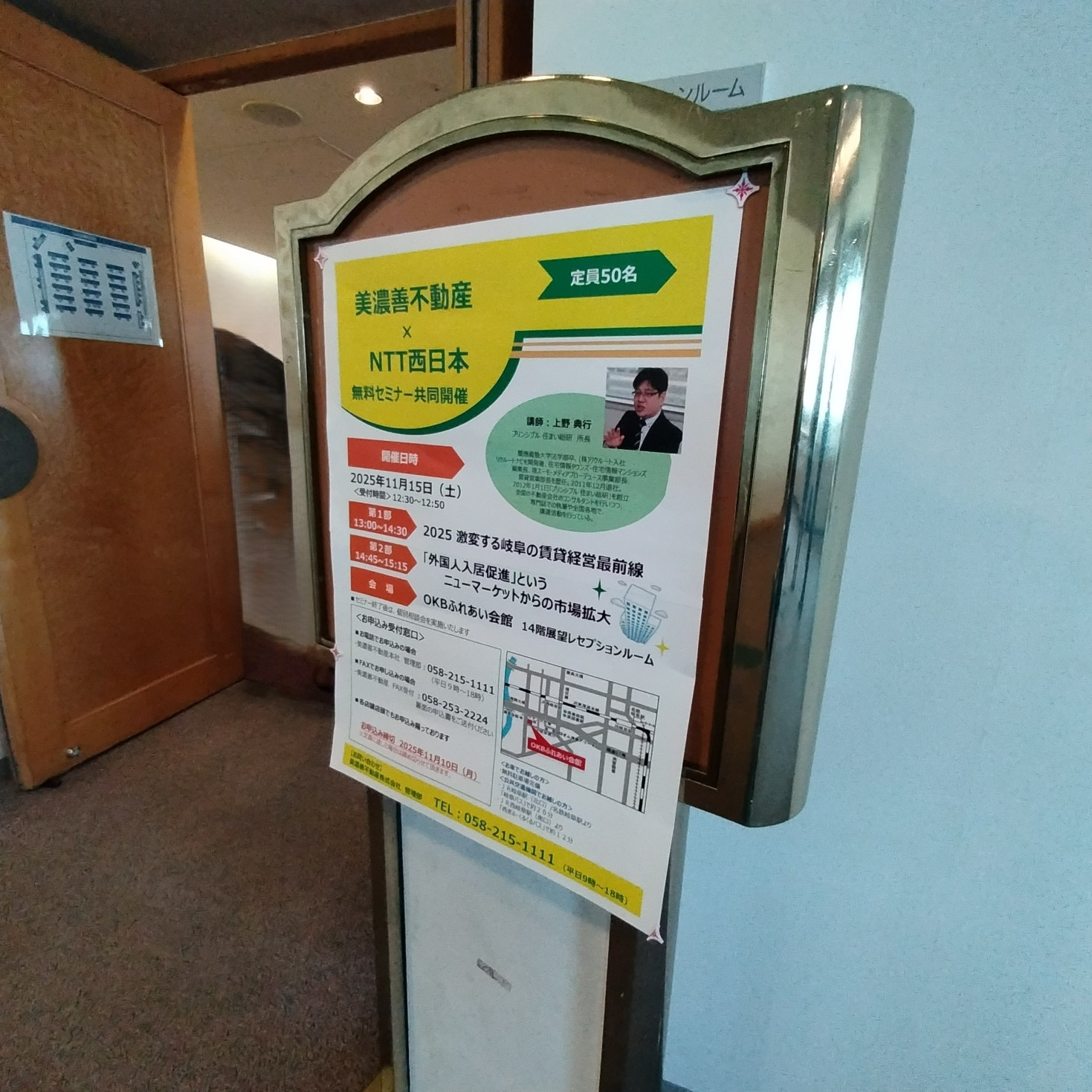 2025年11月15日、美濃善不動産はNTT西日本様との共催により、岐阜市内にあるOKBふれあい会館14階展望レセプションルームにて特別セミナーを開催いたしました。講師にはプリンシプル住まい総研の上野典行様をお迎えし、地域の賃貸経営者様、不動産オーナー様、そして不動産業界に関心を持つ多くの方々にご参加いただきました。今回のテーマは「岐阜の賃貸経営最前線」と「外国人入居促進というニューマーケットからの市場拡大」。まさに時代の変化を捉えた内容であり、参加者の皆様からは「大変勉強になった」「新たな気付きがたくさんあった」とのありがたいお言葉をいただきました。