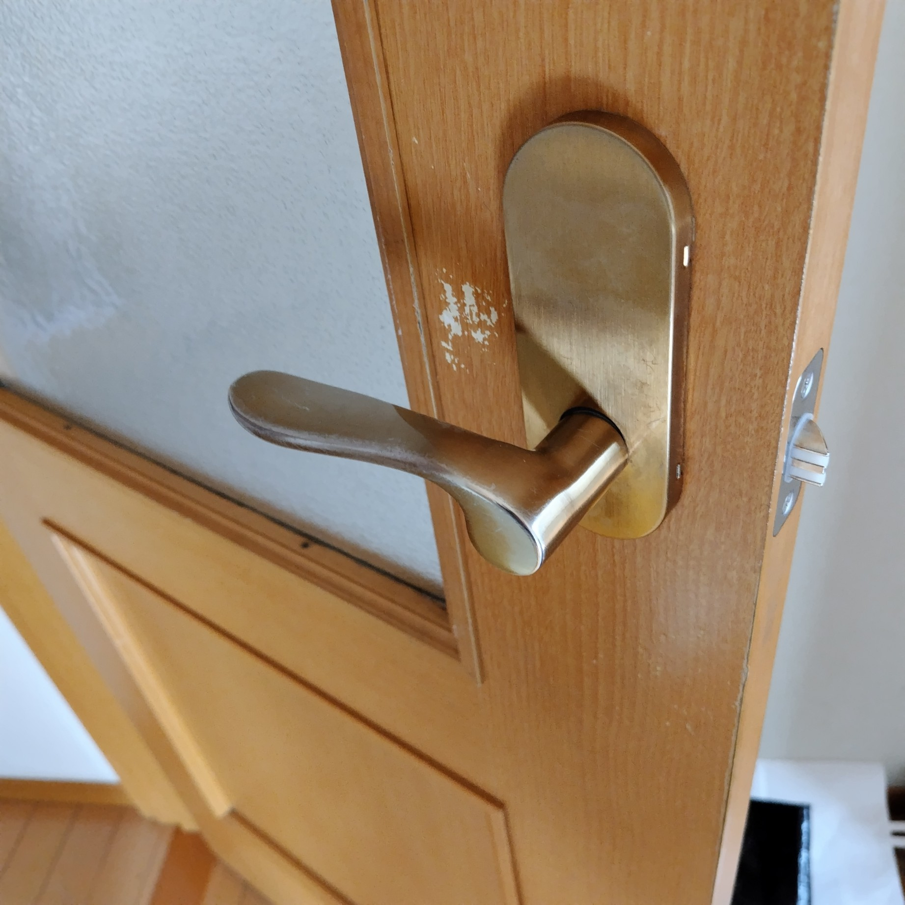 訪問してドアの状態を確認したところ、まず目についたのはレバーハンドルが水平位置まで戻らず、常に微妙に下がっているという点でした。本来、レバーは内部のバネの力で水平位置に戻るのが正常ですが、今回は戻りきらず、わずかに下がった状態で静止していました。