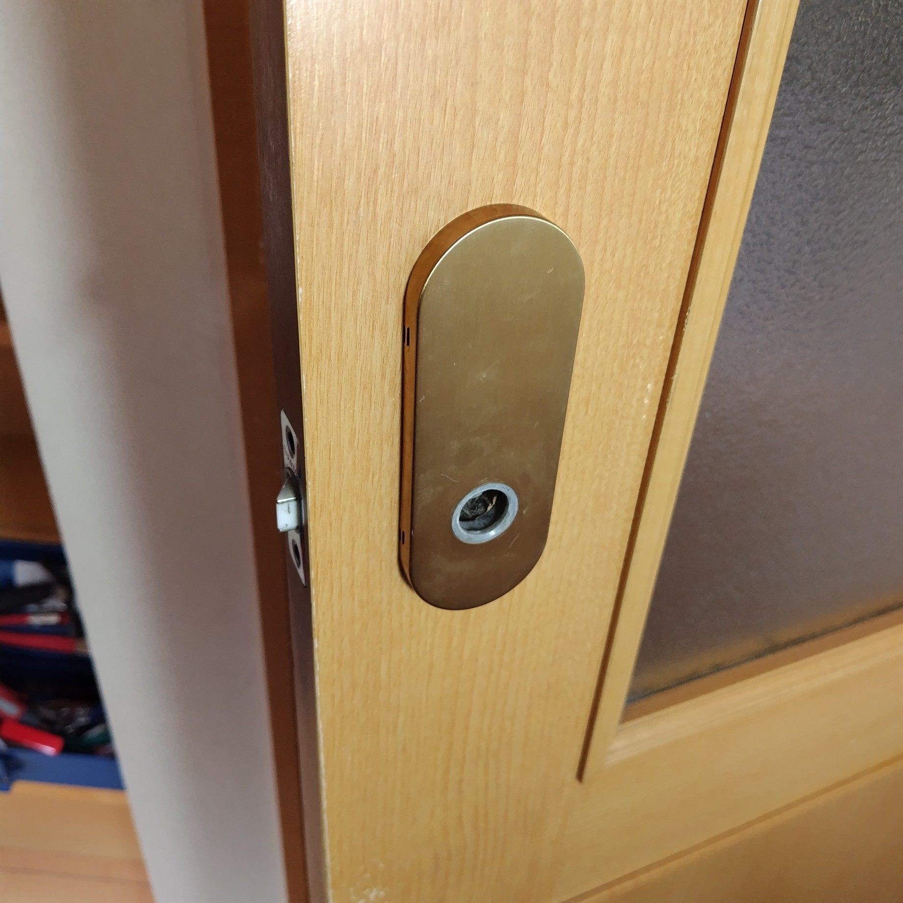 その際は下敷きを差し込んでラッチを引っ込ませてドアを開けました。